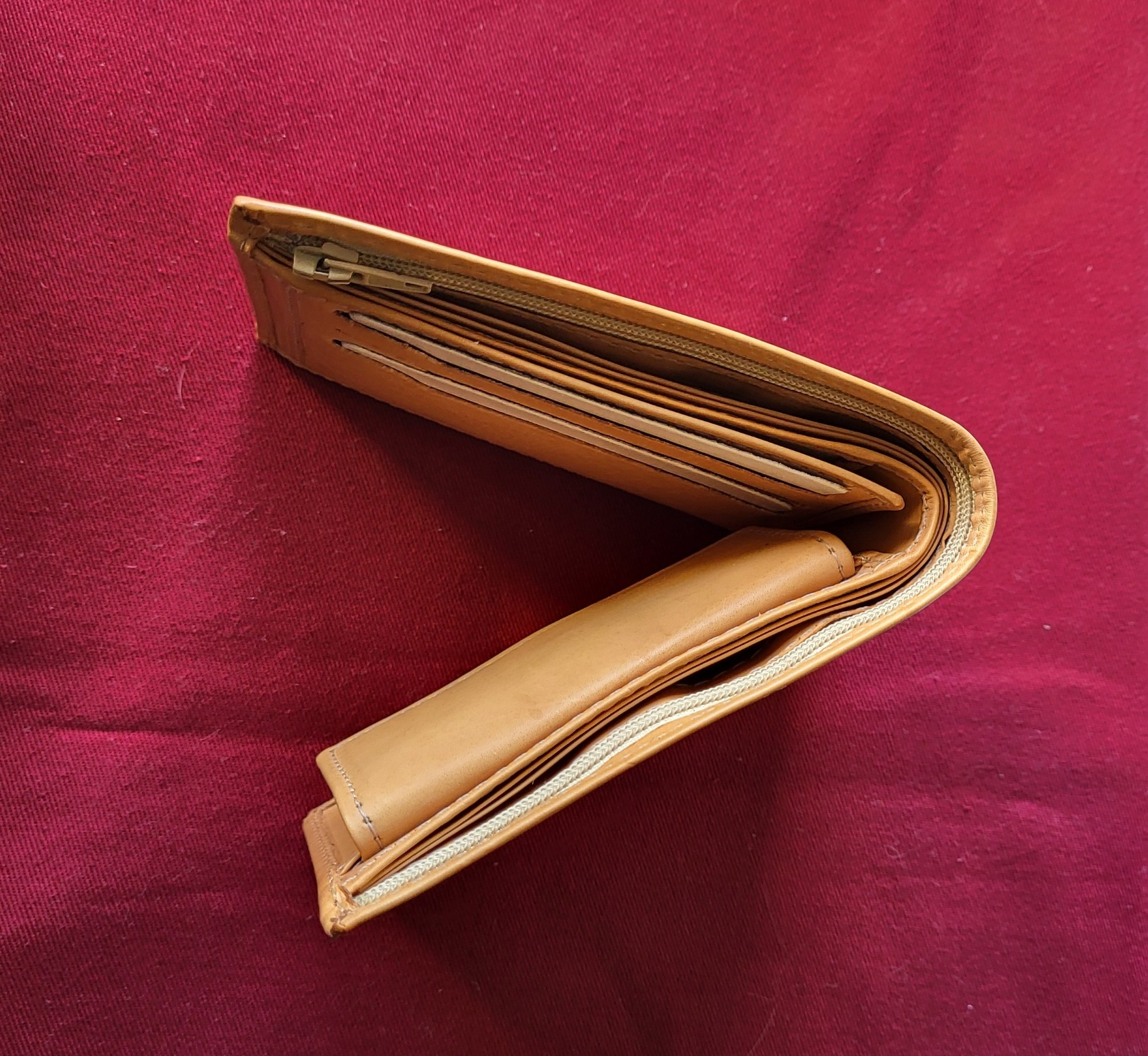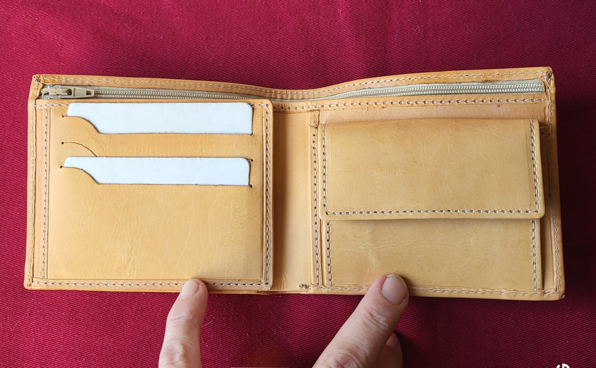 place pour 3 cartes de crédit 2 compartiments pour les photos à gauche , 1 compartiment pour la monnaie et pour des documents à droite ainsi que 3 compartiments pour les billets et 1 compartiment avec fermeture éclair .
